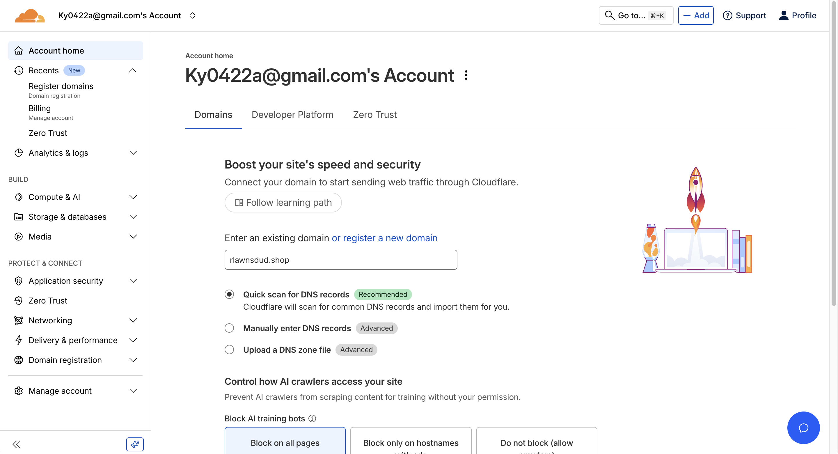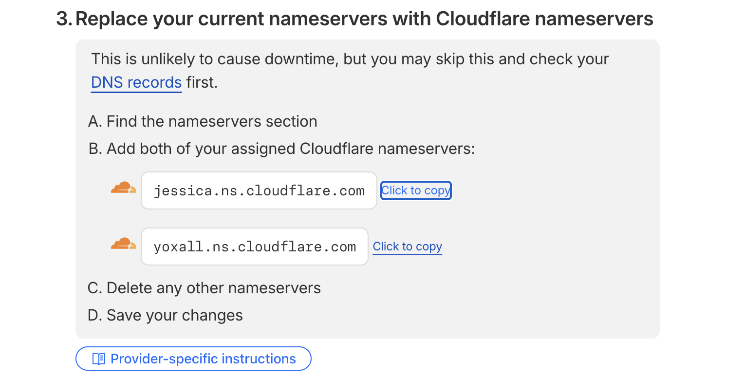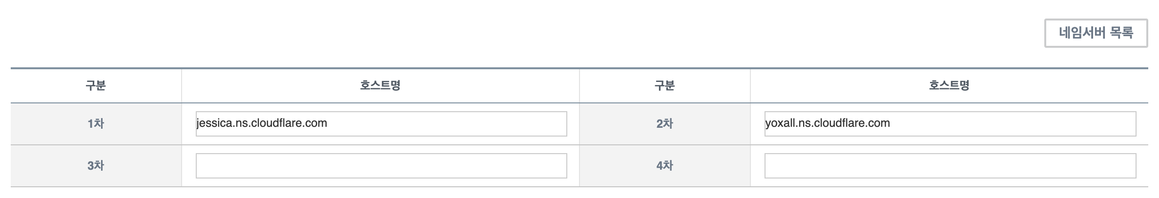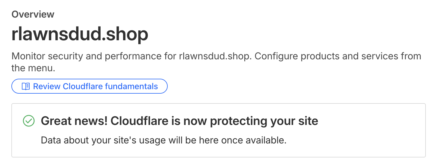 만약 도메인을 등록한적이 없다면 위와 같이 도메인을 등록하라고 안내한다. 구매한 도메인을 입력하하고 넘어가보면 아래와 같이 2개의 Cloudflare NS를 제공해주는 것을 볼 수 있다.