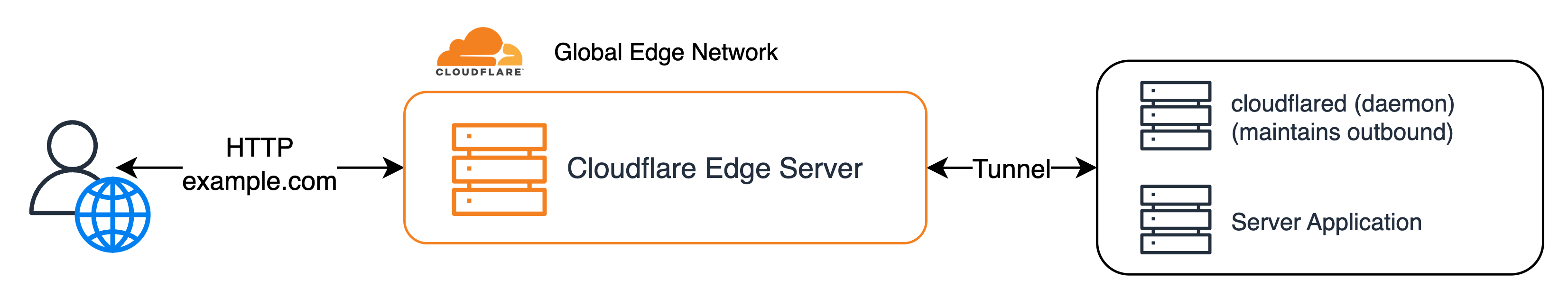 Cloudflare Tunnel은 서버에 cloudflared라는 데몬 프로세스를 실행시키고, Cloudflare를 통해 들어온 트래픽만 cloudflared가 받아서 서버(로컬 서비스)에 전달하며, 서버에서 다시 cloudflared로 응답을 보내 Cloudflare Tunnel을 통해 외부 사용자에게 전달한다. (cloudflared 연결 유지는 WebSocket 기반)