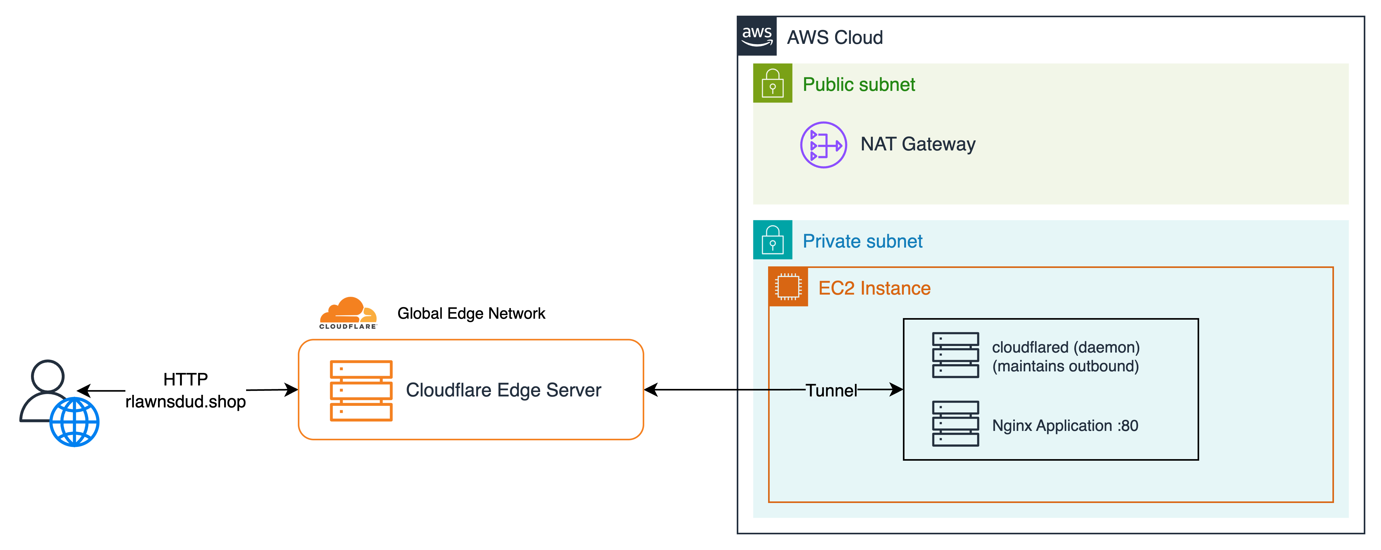 Cloudflare에서 들어온 요청/응답만 cloudflared를 통해 전달되기 때문에 그 외의 아웃바운드 트래픽은 기존의 NAT Gateway 등으로 보내진다.