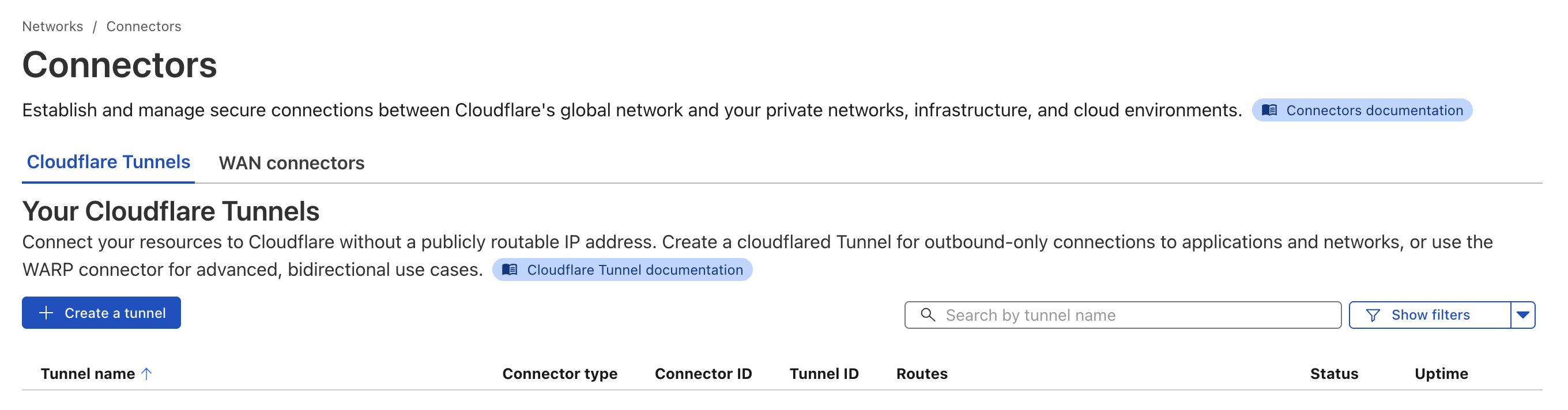 Cloudflare Zero Trust 탭에 들어가면 위와 같이 나타날 것이다. 여기서 왼쪽 사이드바에 Networks > Connectors로 들어간다.