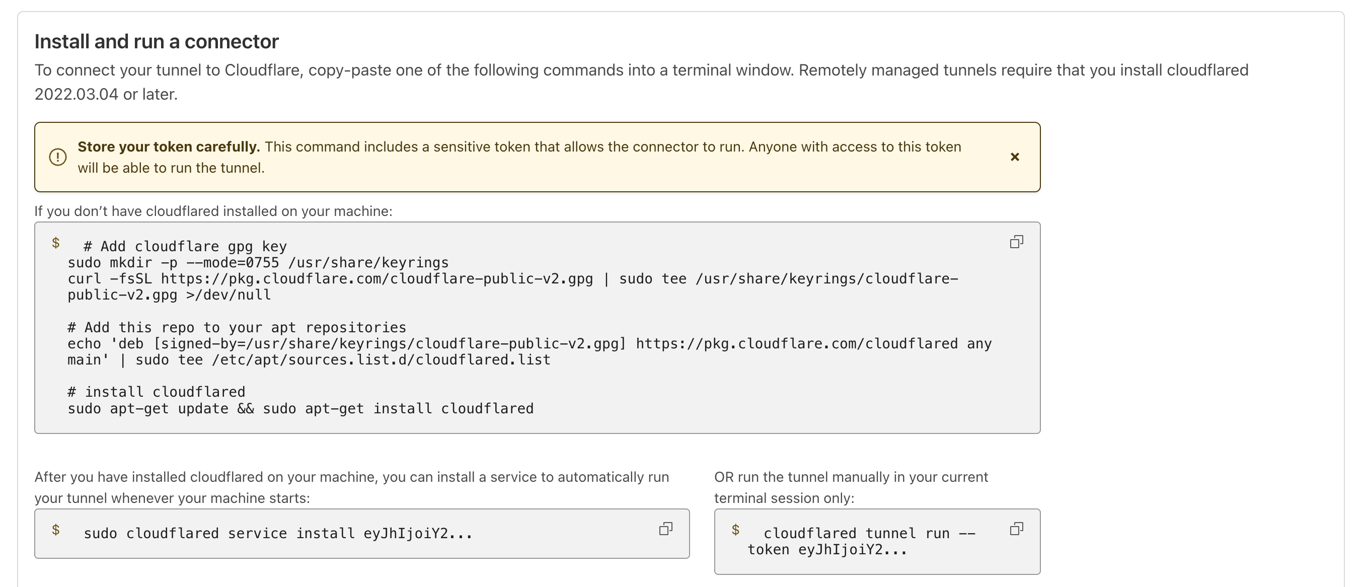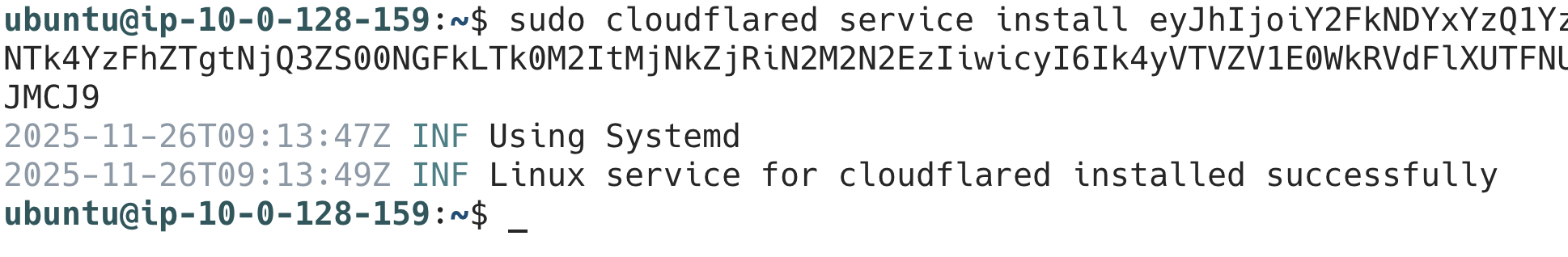 sudo apt-get update && sudo apt-get install cloudflaredsudo cloudflared service install eyJhIjoiY2FkNDYxYzQ1YzY1M...