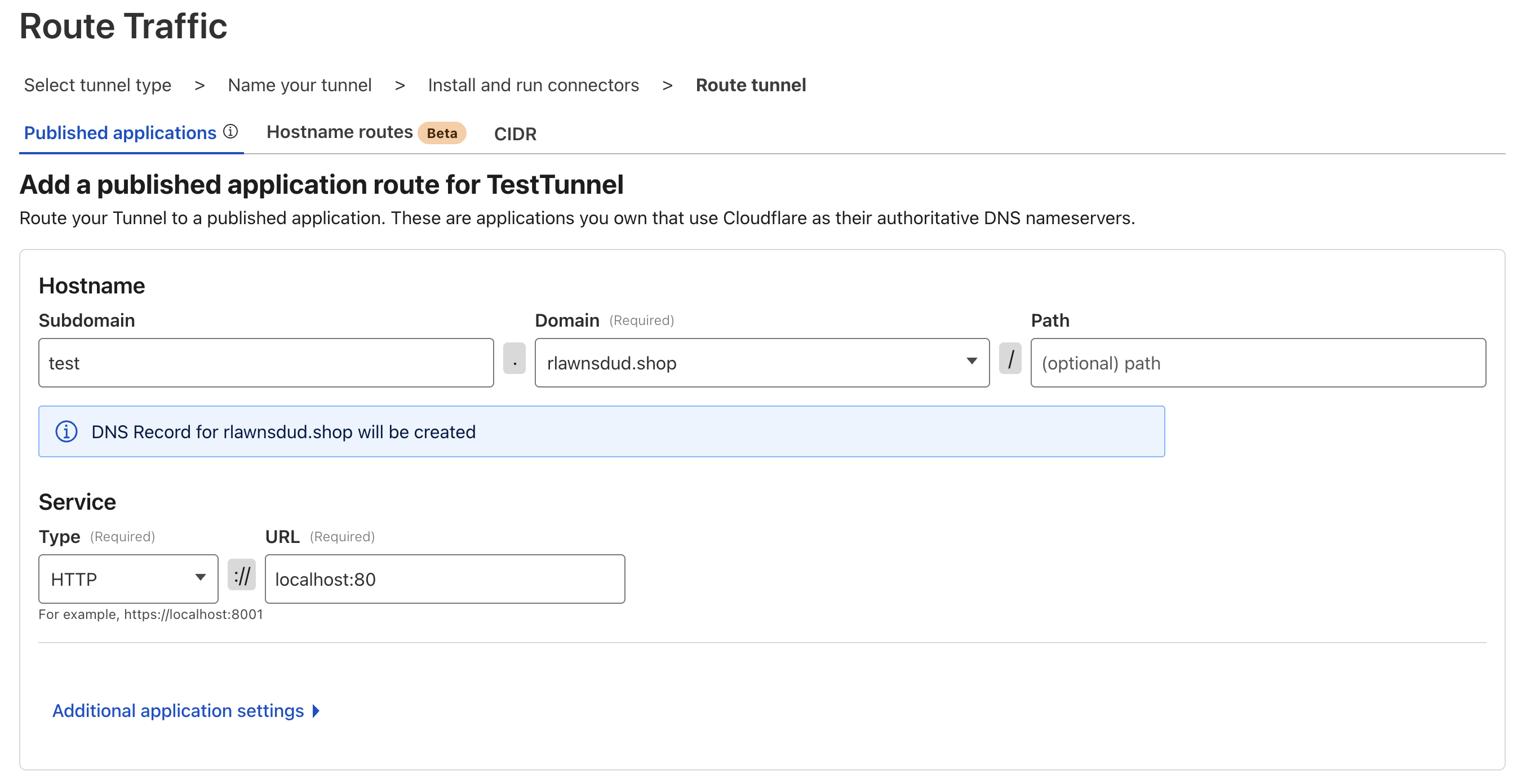 그럼 위와 같이 Connectors에 추가된 것을 볼 수 있다. 그리고 연결할 Nginx 앱의 주소(http://localhost:80)와 연결한 도메인을 선택하자.