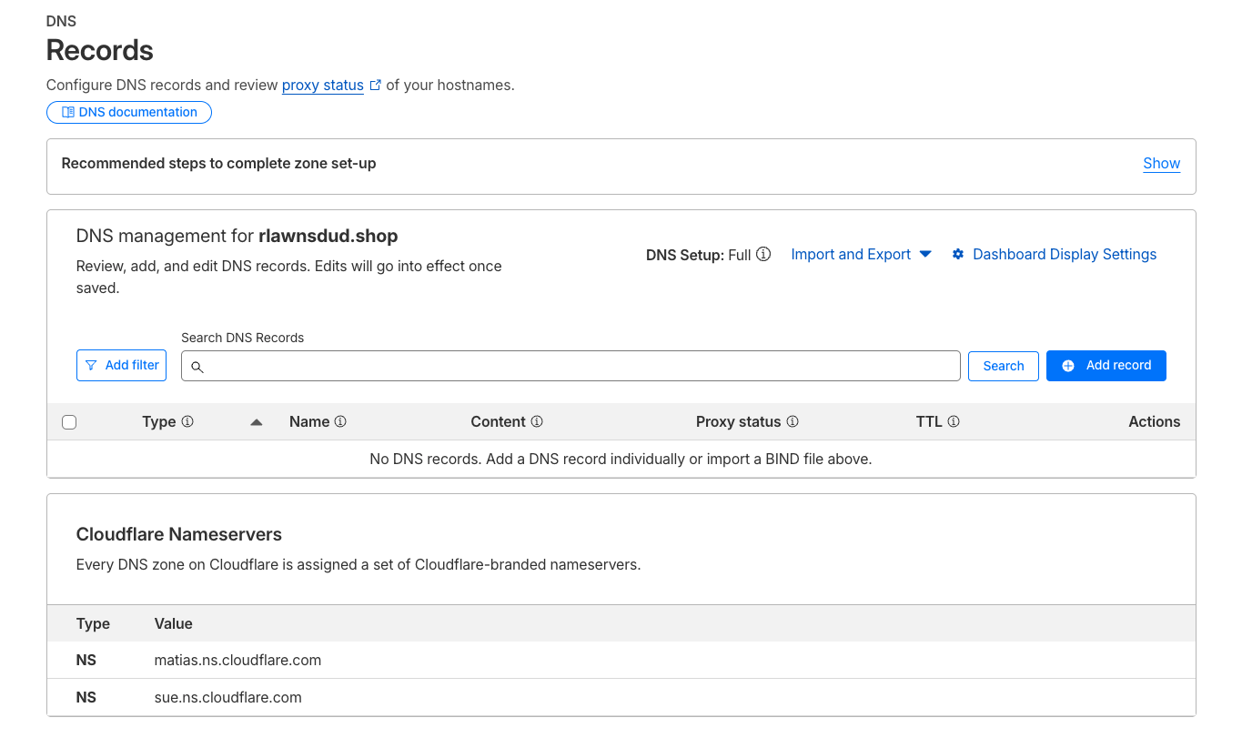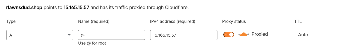 Cloudflare DNS 서버로 설정을 하였다면 Origin 서버의 레코드를 만들어줘야한다. 이는 DNS 레코드 설정에서 확인해볼 수 있다.