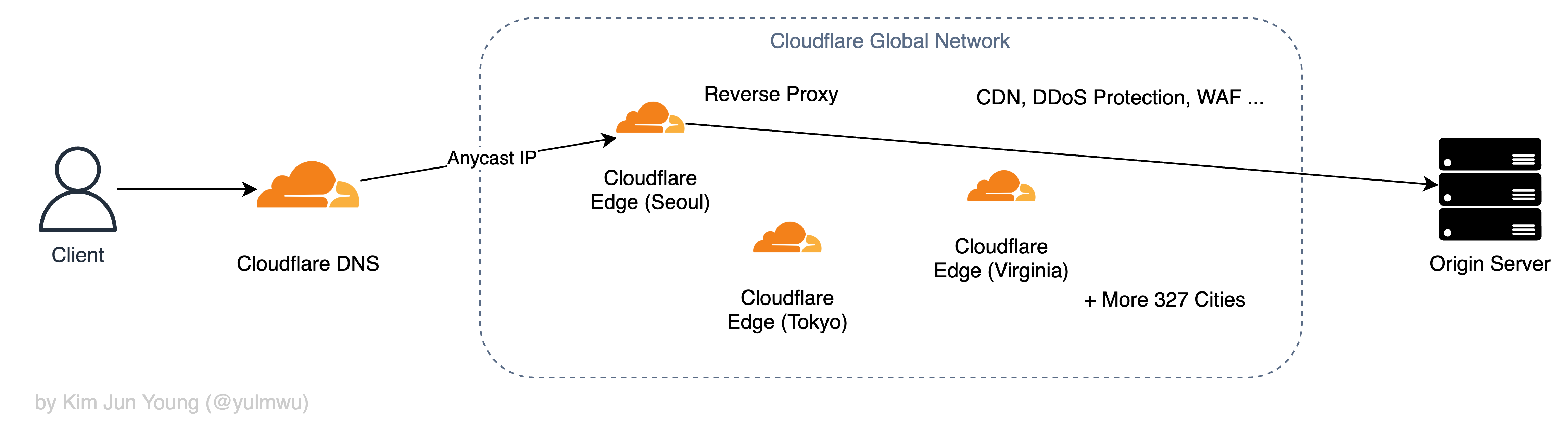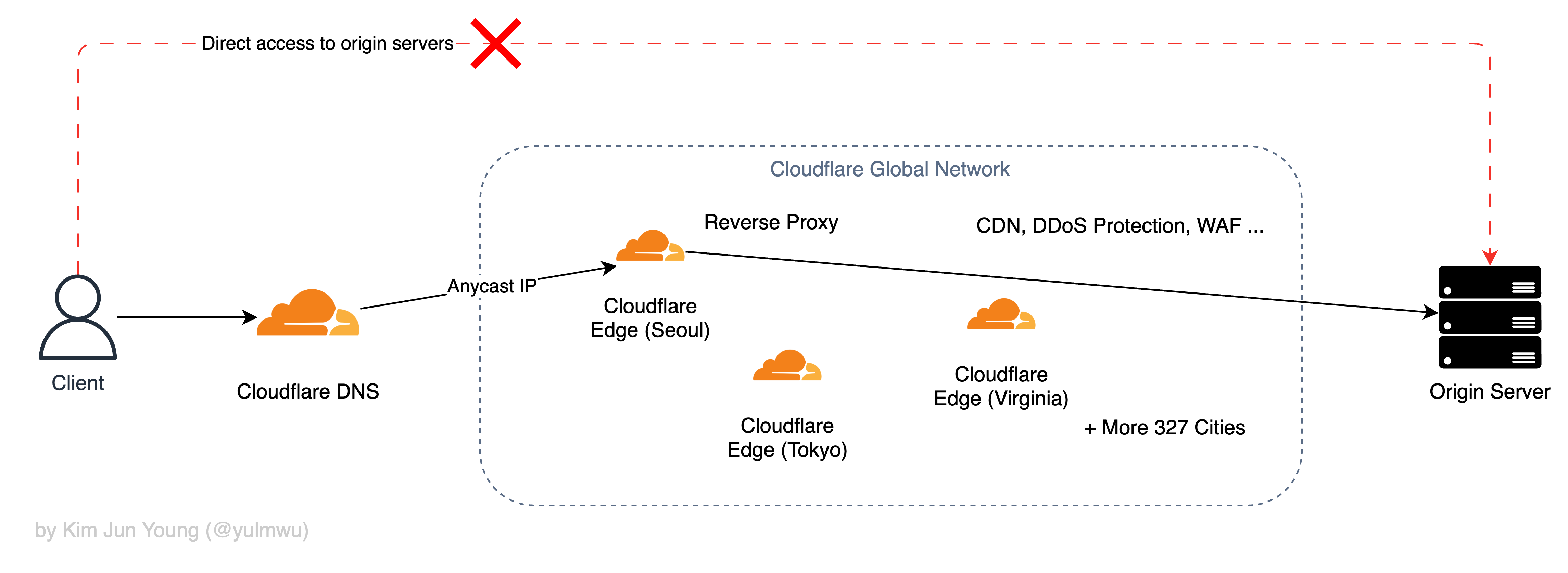 클라우드 기반의 DDoS 방어 서비스의 대명사인, 그리고 글로벌 CDN 서비스이기도 한 Cloudflare를 사용해볼 수 있는데, Cloudflare를 포함한 대부분의 클라우드 기반의 DDoS 방어 서비스는 아래와 같이 동작한다.