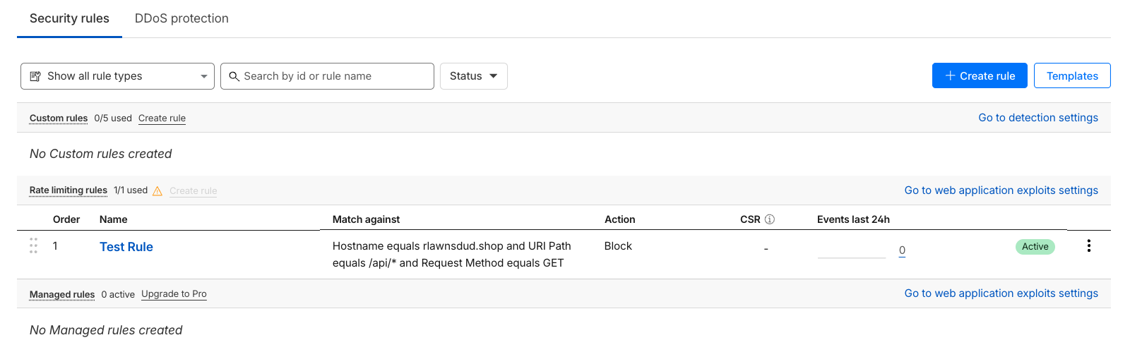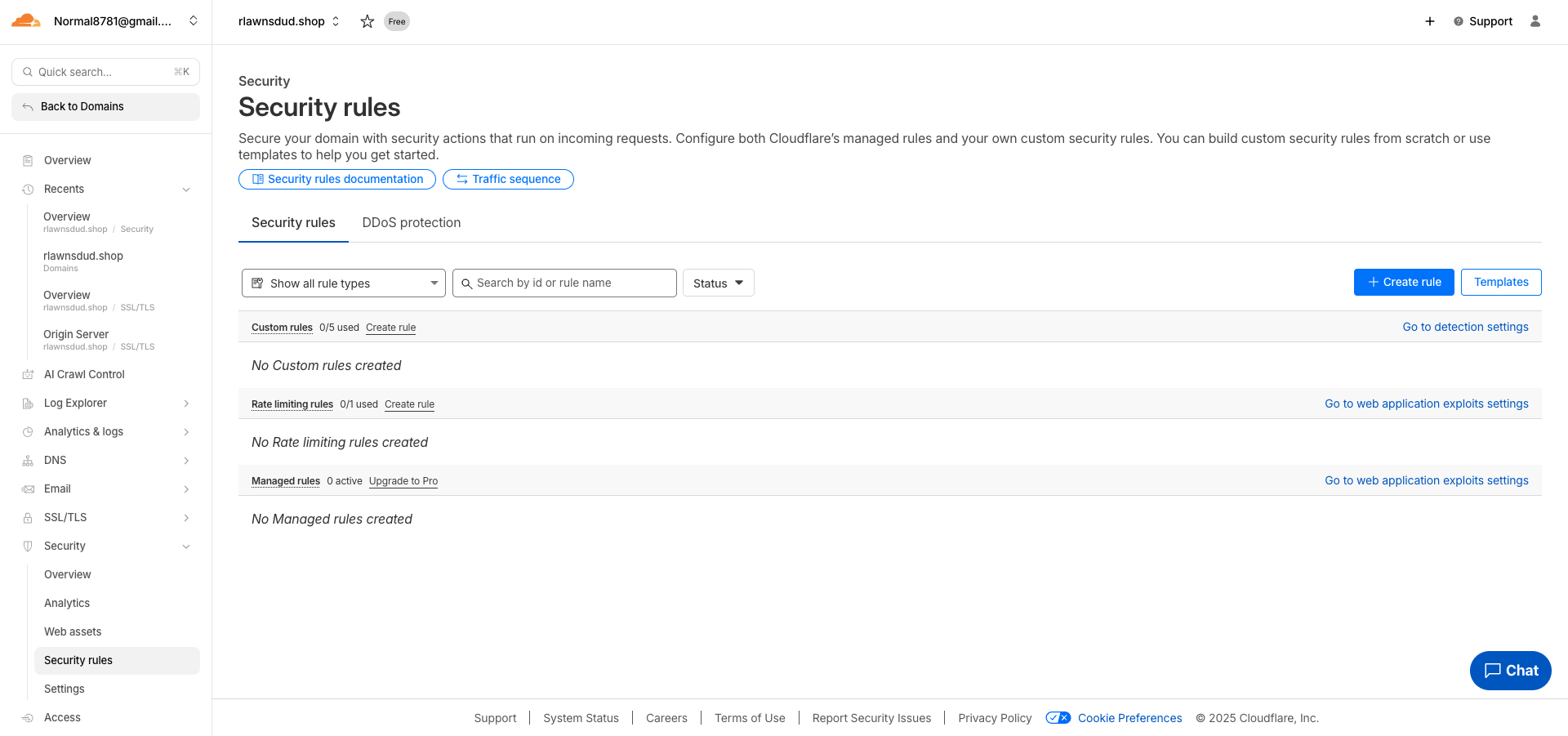 앞서 말했 듯 실제 DDoS를 실습하는 것은 법적으로 문제가 될 수 있고, Cloudflare의 무료 플랜에서 진행하는 실습 상 Rate Limiting을 구성하는 것을 중점으로 둘 것이다. 무료 플랜에서도 제한적으로 IP 기반의 Rate Limiting을 구성해볼 수 있다.