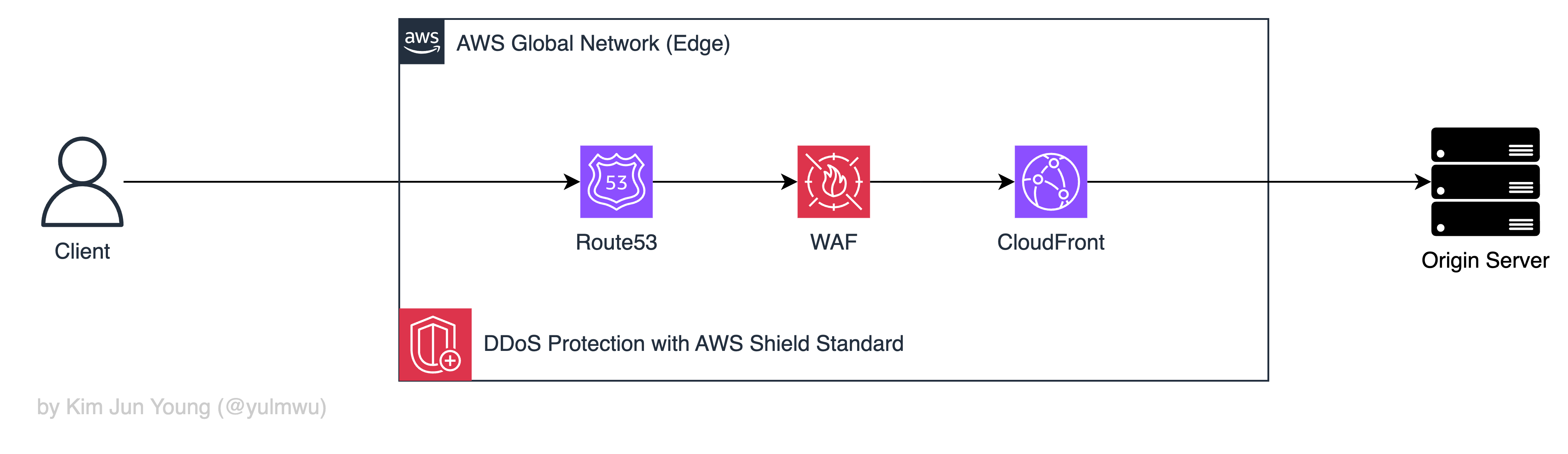 클라우드 네이티브 인프라를 구성하면서 대표적인, 그리고 가장 많이 사용되는 클라우드 벤더가 AWS이다. 이러한 AWS에서도 Cloudflare와 비슷한 동작의 DDoS 방어 시스템(솔루션)을 제공하는데, 크게 AWS Shield와 AWS WAF로 구성된다. 눈치가 좋다면 알 수 있겠지만 Shield는 L3/L4, WAF는 L7 트래픽을 담당하는 것이다. (Shield Standard 기준)