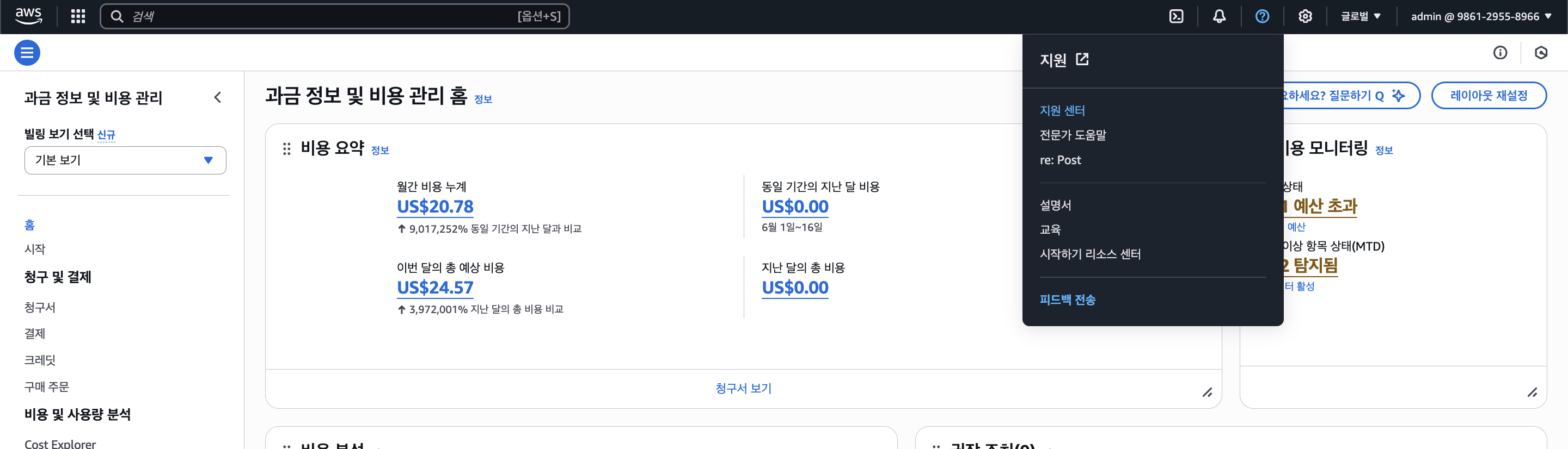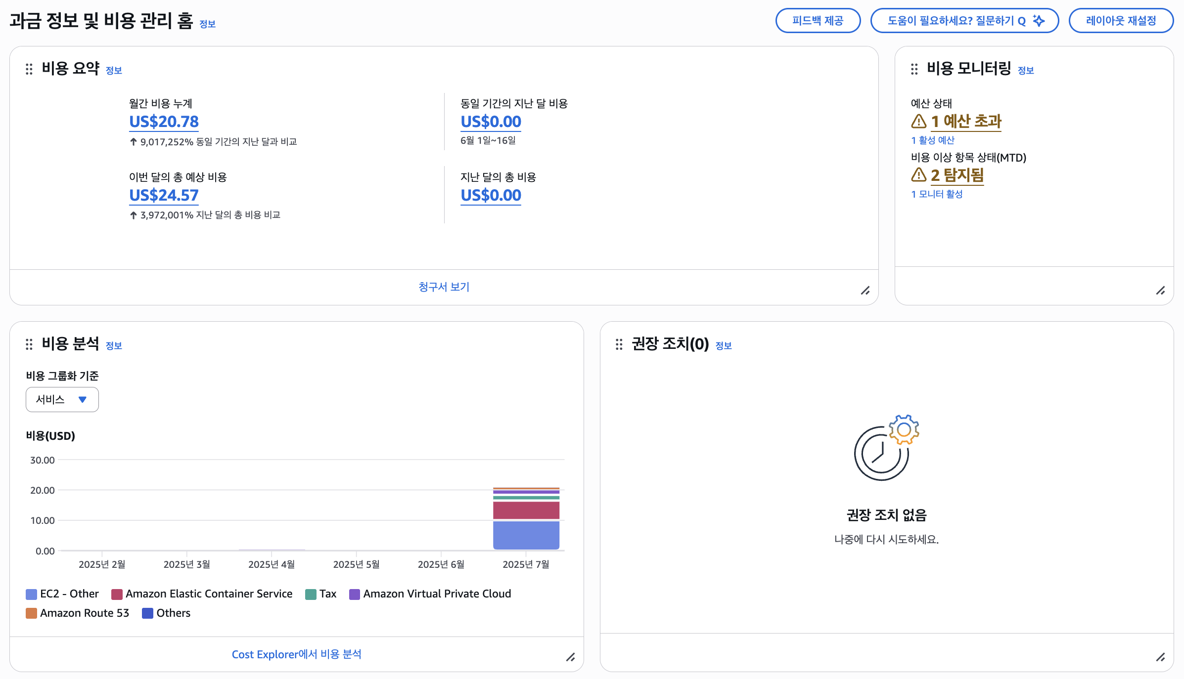 프리티어 범위에 포함되지 않아 돈이 나가는 서비스는 어쩔 수 없이 그냥 사용하고 있는데, 교내에서 프로젝트를 진행하면서 AWS를 좀 오래 켜둘 일이 있었다.