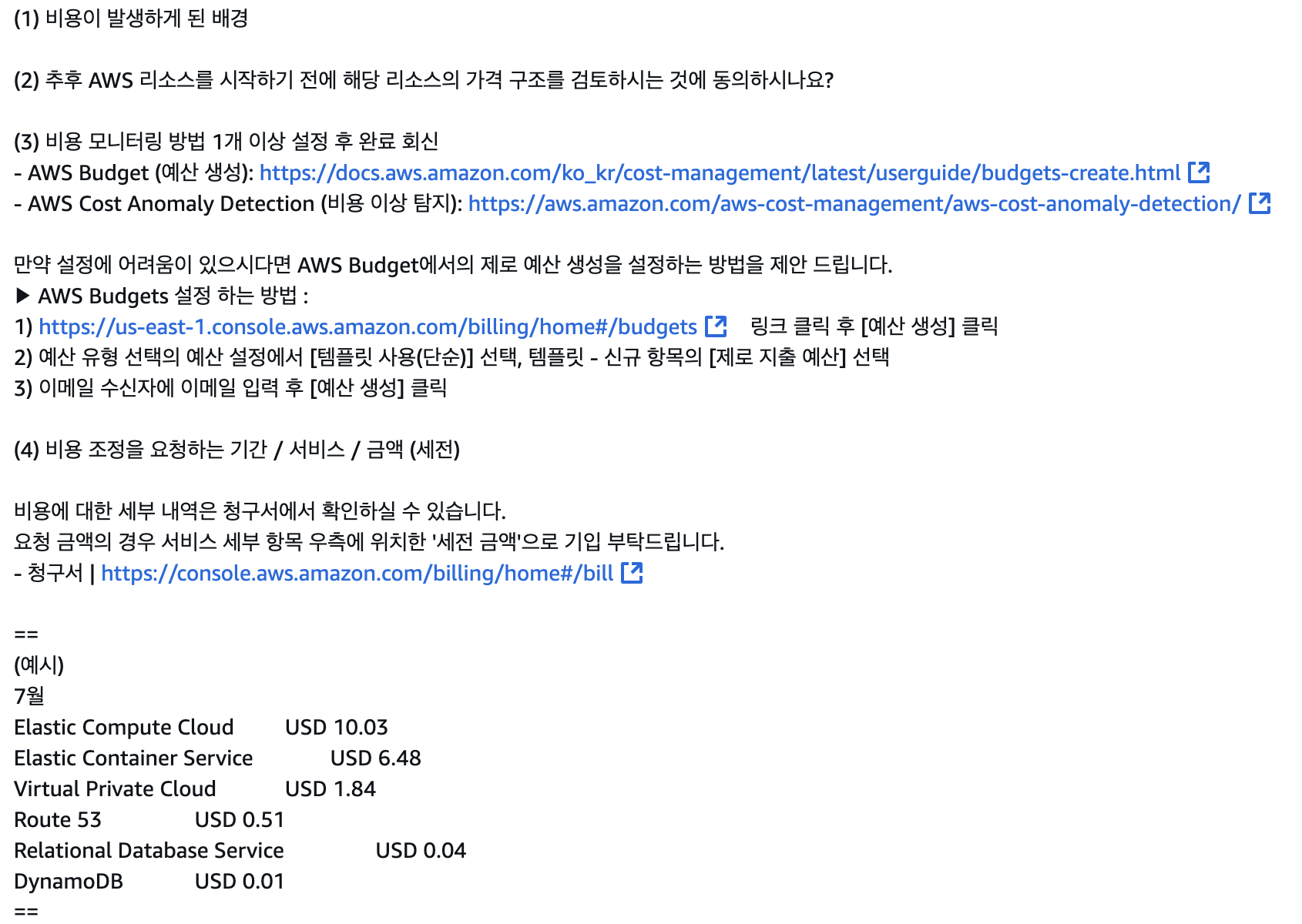 DynamoDB의 경우 자료가 남아있어 지우긴 꺼려졌지만 지워달라니 대충 백업하고 지웠다. 나머지도 다 지웠고, 다음으로 더욱 세부적인 정보를 달라고 하였다.