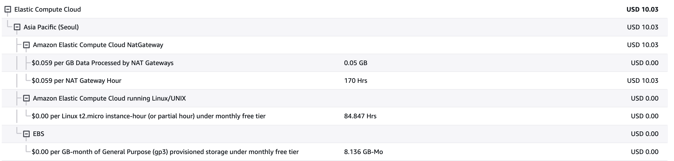 - NAT Gateway가 프로비저닝된 상태에서 요금이 그정도로 비쌀 줄은 몰랐다. (시간당 0.059달러인데 이유는 모르겠으나 실행 시간이 총 170시간이나 됐었음)