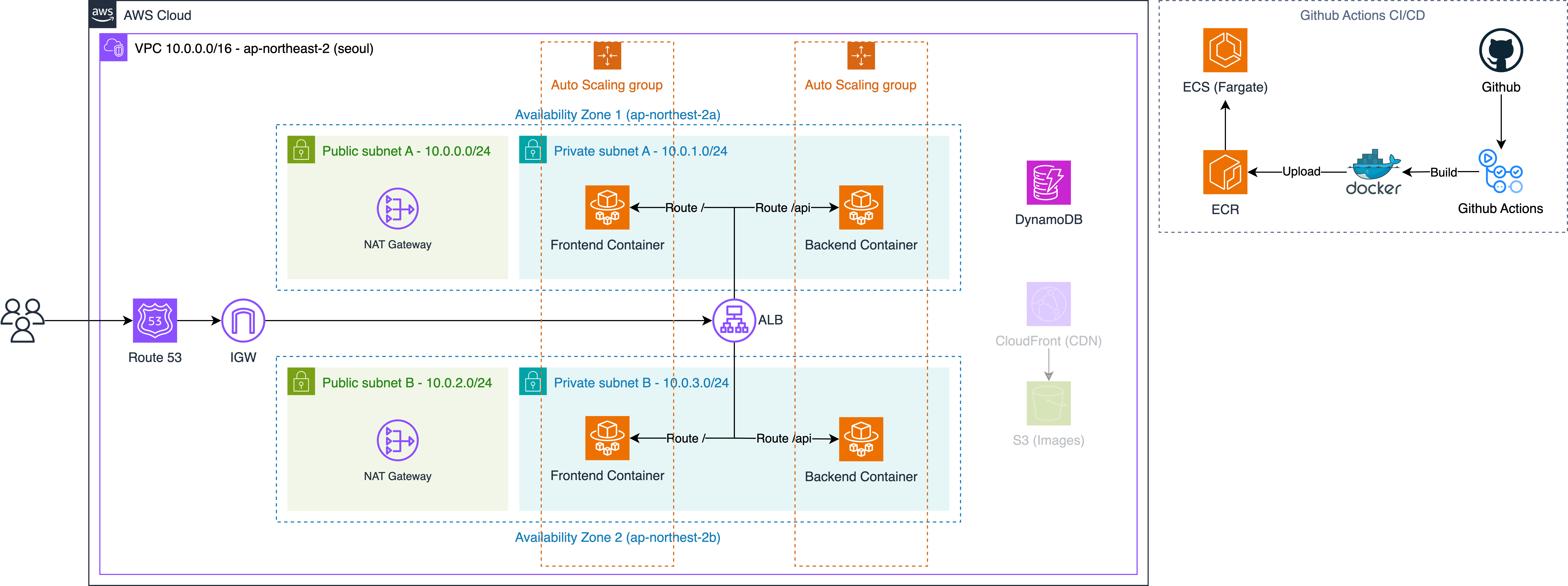 마침 ECS Fargate를 사용하며 좋은 성적을 위해 고가용성 등의 요소를 곁들여서 제작하였다. 그 문제의 아키텍처가 아래와 같다.