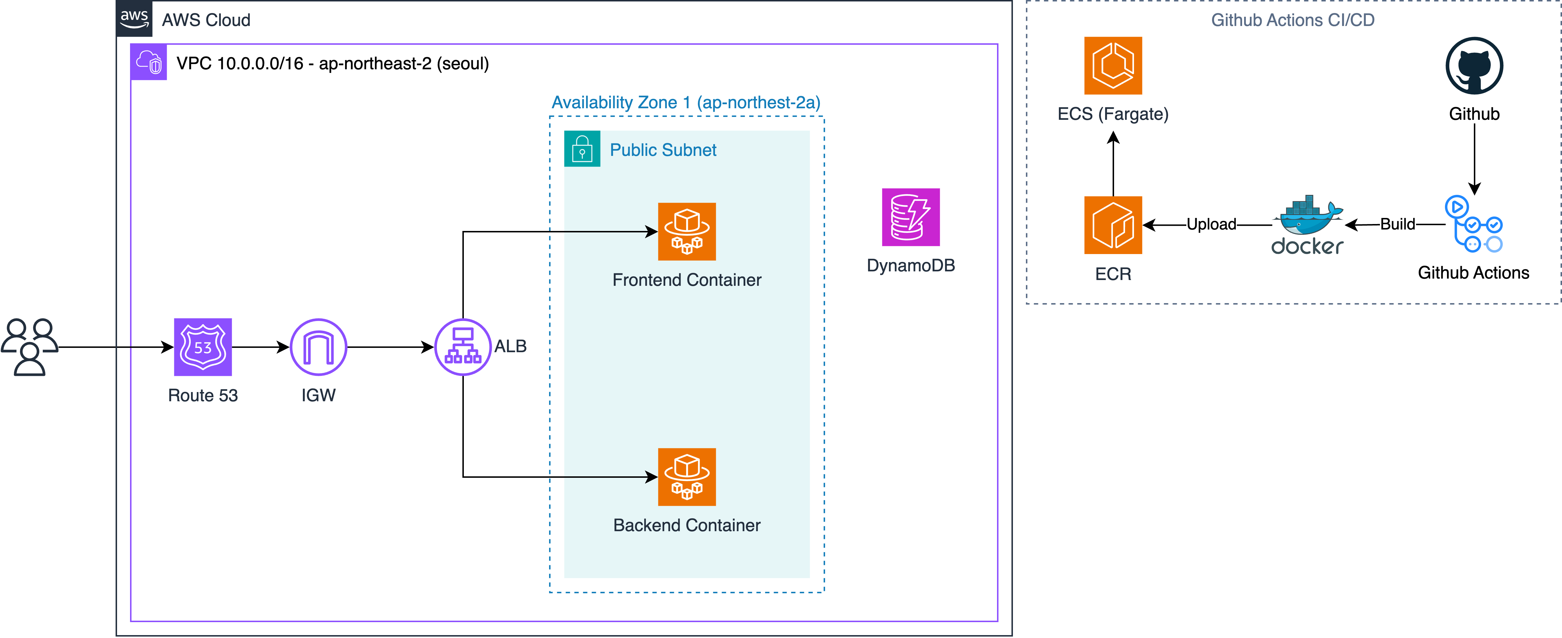 그래서 일단 서비스는 해야하고, 돈이 아깝기도 해서 가용성이나 보안은 옆지 고양이한테 줘버리고 아래와 같이 바꿨다. (각 ECS 컨테이너에 Public IP 부여하는 식으로)