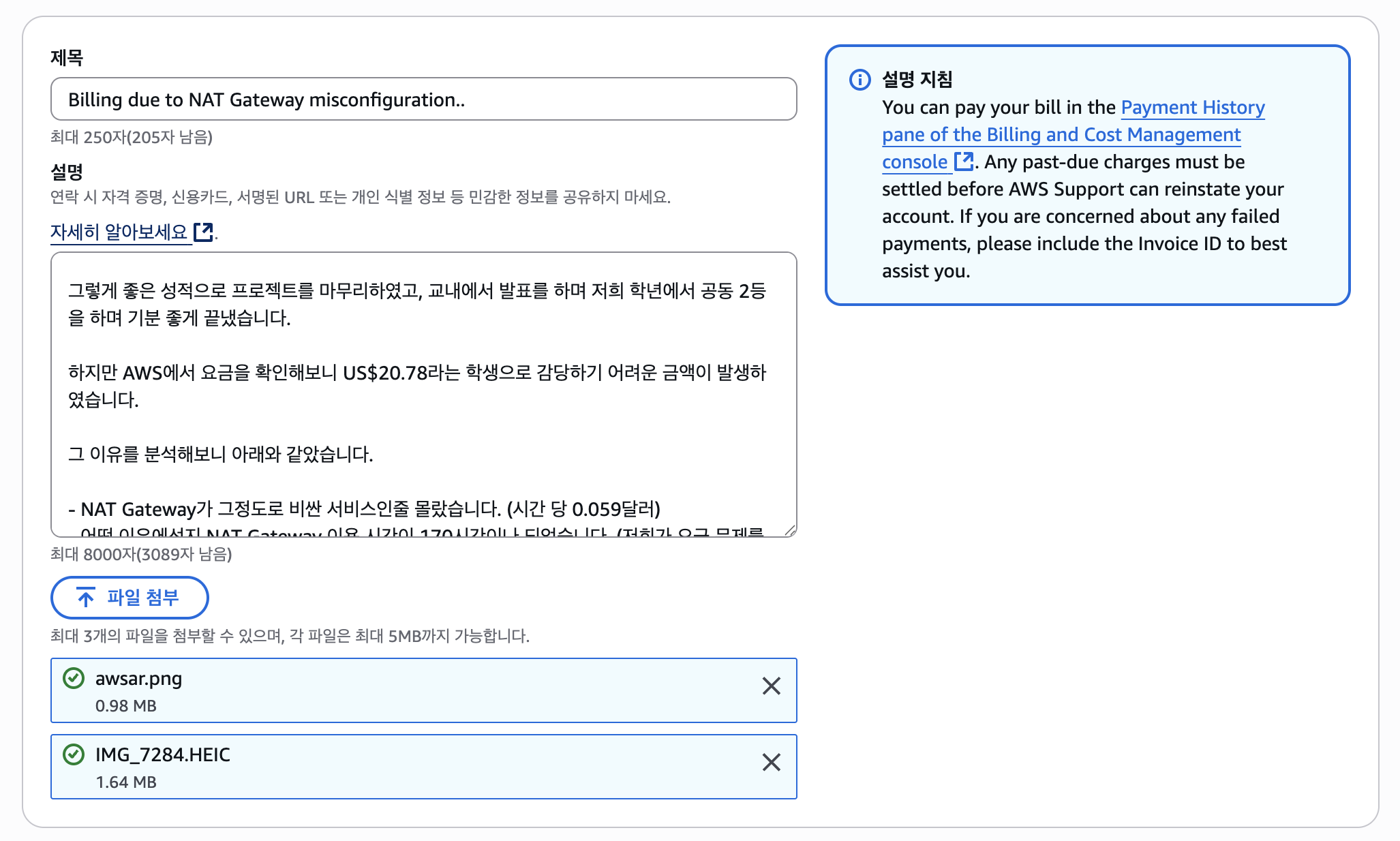 내용을 적어주고, 관련 이미지 2개도 첨부하였다.
