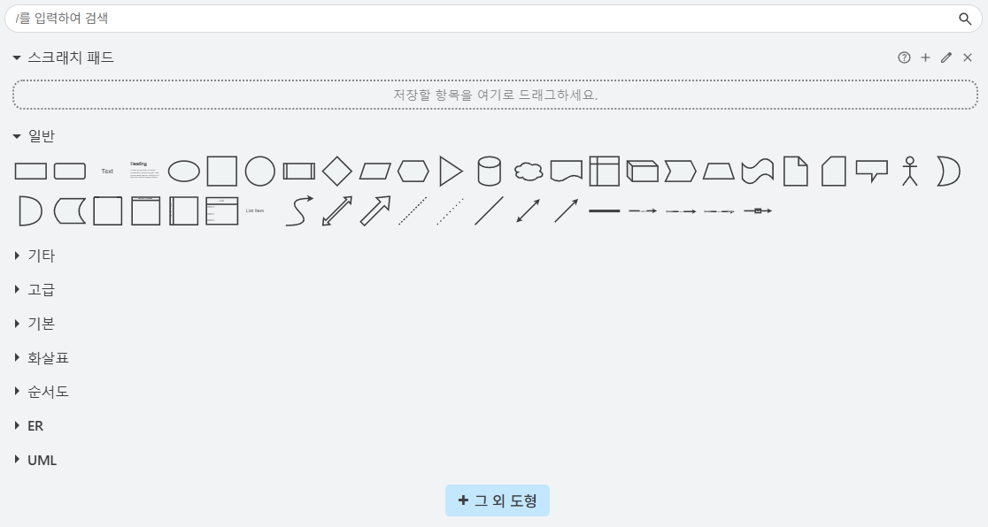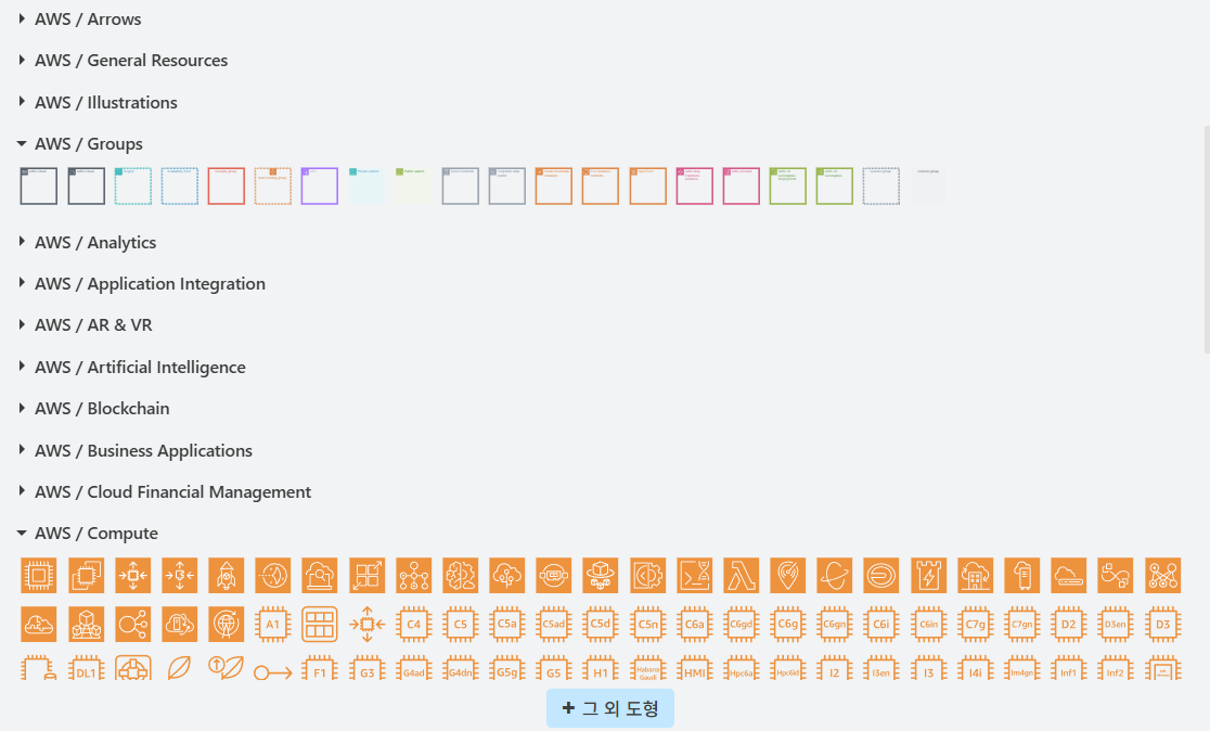 그런데 찾아보면 AWS 아키텍처와 관련된 다이어그램 도형은 없는데, 아래의 "그 외 도형" 버튼을 클릭하자.