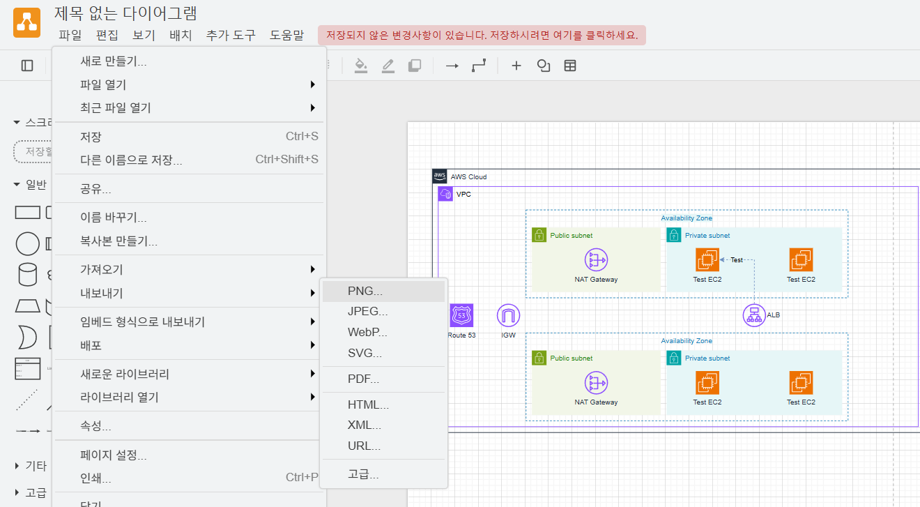 마지막으로 저장 시 .drawio 파일로 저장이 되는데, 이미지를 내보내려면 파일 메뉴에서 내보내기 항목을 클릭하자.