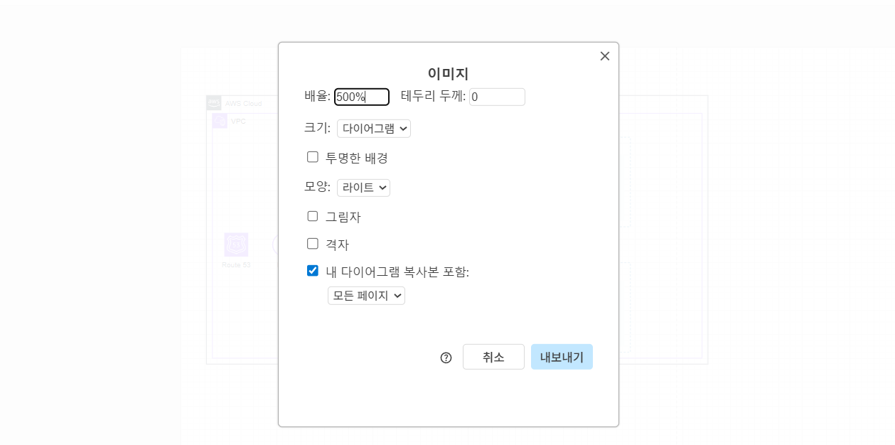 그리고 배율의 경우 필자는 500%로 설정한다. 100%는 블로그 같은데 올릴 시 이미지가 작아 깨져보인다. 적당히 조절하여 내보내면 아키텍처 이미지가 만들어진다.