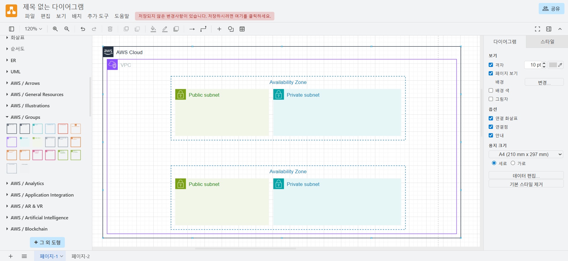 필자가 가장 추천하고, 또 가장 자주 사용하는 서비스이다. 꼭 AWS와 관려된게 아니여도 다이어그램을 그려야 한다면 draw.io를 애용한다.