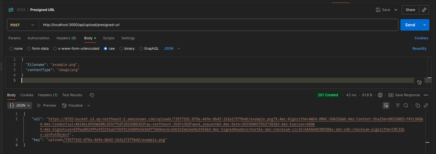 그리고 /upload/presigned-url 엔드포인트를 호출하여 Presigned URL을 발급받는다.