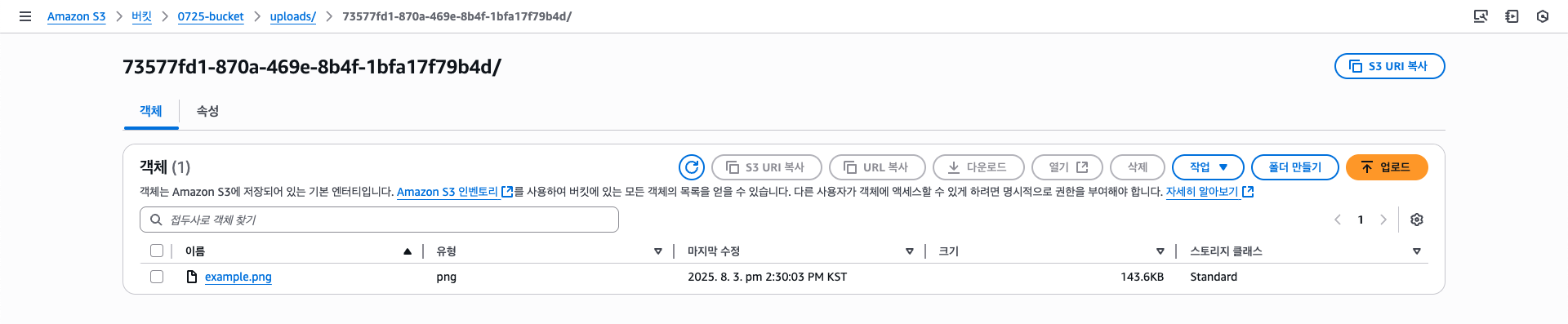 export * from './response.dto'필자는 업로드 시 UUID를 포함하게 하였기 때문에 응답 DTO에 해당 객체의 키를 반환하도록 하였다.