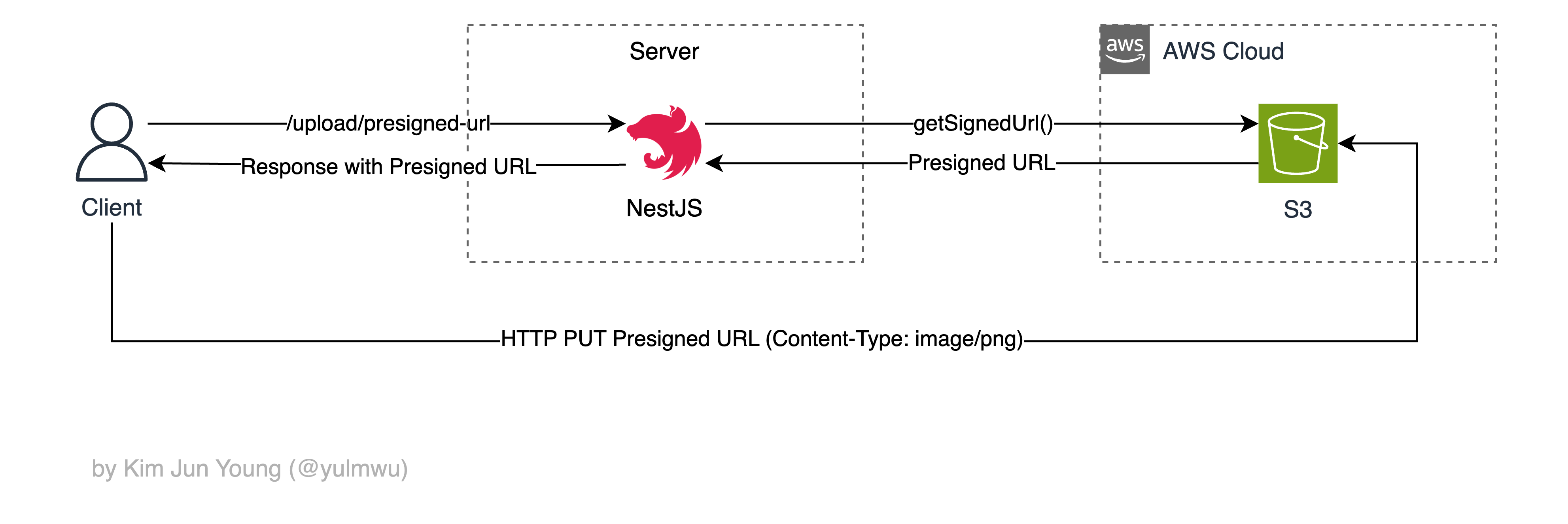 그래서 AWS S3에선 Presigned URL(미리 서명된 URL)을 지원한다. 이것을 사용한다면 아래와 같이 업로드 기능을 구현할 수 있다.