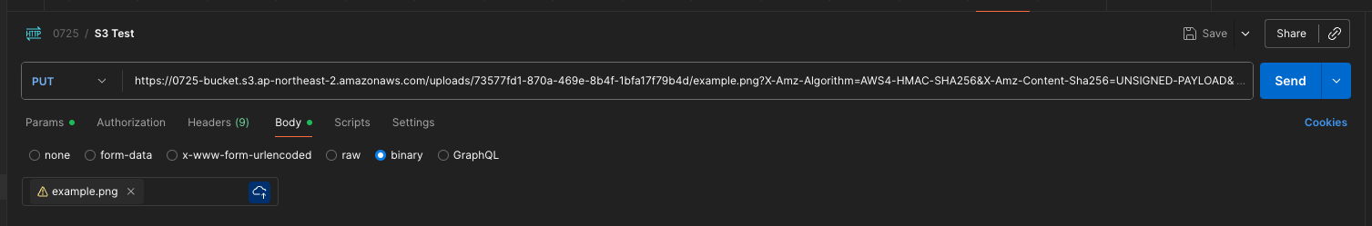 그리고 응답에서 Presigned URL을 복사한 뒤 PUT 요청을 통해 이미지를 업로드해보자.