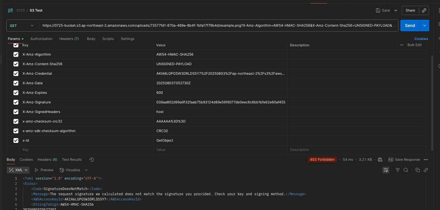 이제 S3 버킷을 확인해보면 사진과 같이 업로드가 된것을 볼 수 있다. 참고로 해당 Presigned URL은 Put Object에만 유효하기 때문에 GET 등으로 테스트해보면 안되는 것을 볼 수 있다.
